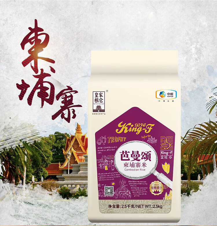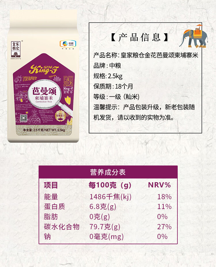 商品名称:中粮 皇家粮仓金花芭曼颂柬埔寨米2.5KG 6944910334951