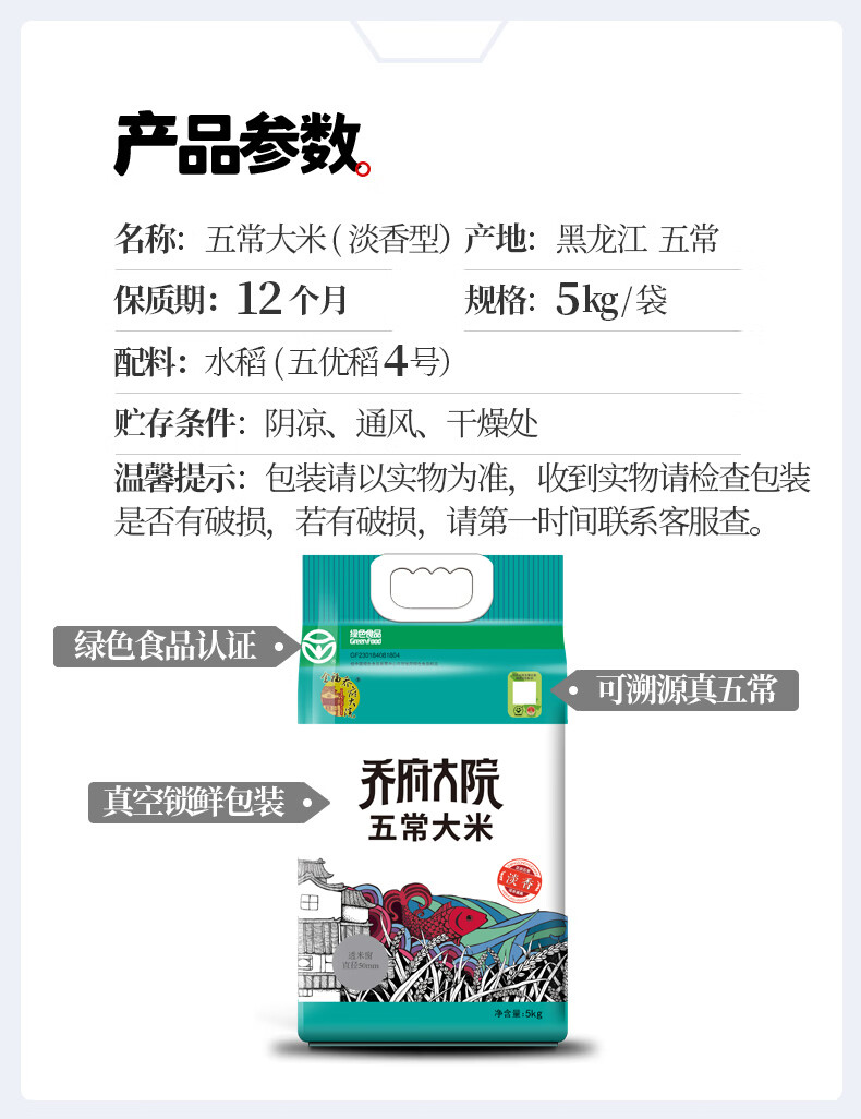 商品名称:金福乔府大院 五常大米(淡香)真空5KG 6937004400519