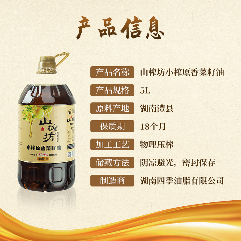 商品名称:山榨坊 小榨原香菜籽油5L 6972802011338