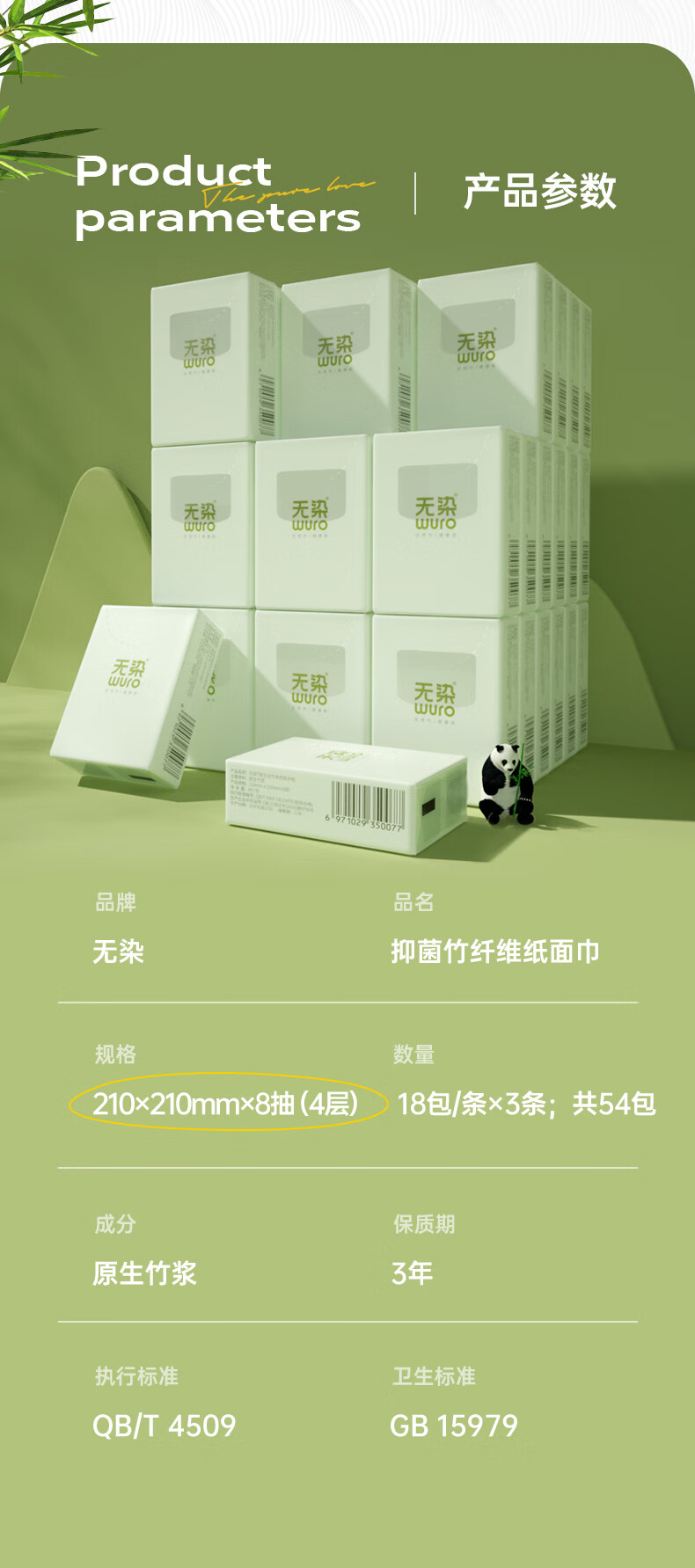 商品名称:无染 竹纤维本色手帕纸210*210mm*4层*8片*18包*3提*1箱