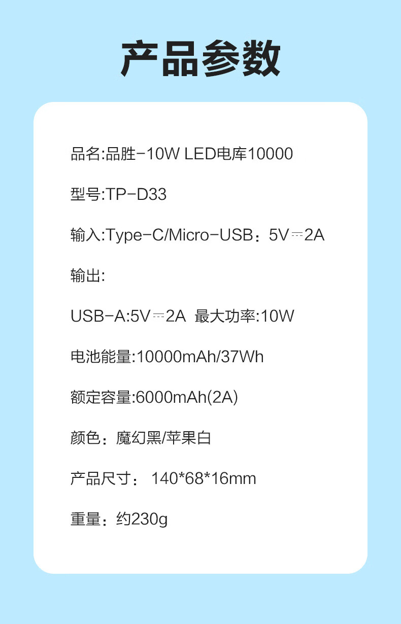 商品名称:品胜 移动电源10W LED电库10000 TP-D33 苹果白