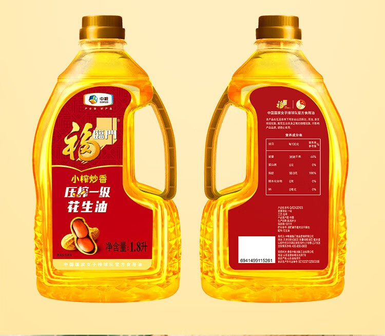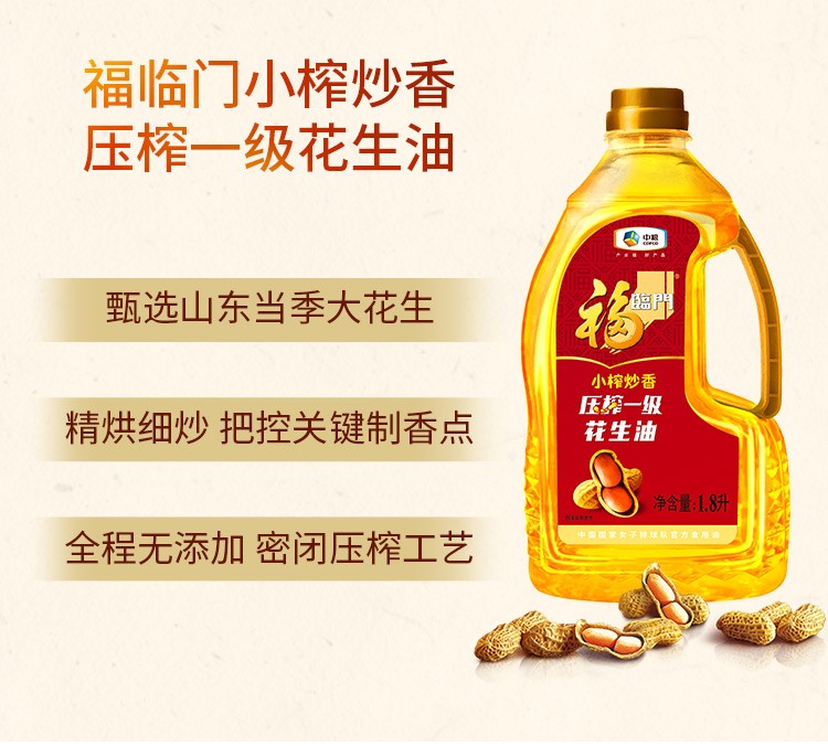 商品名称:福临门小榨炒香压榨一级花生油1.8L山东花生油炒菜煎炸用油 福临门一级花生油1.8L