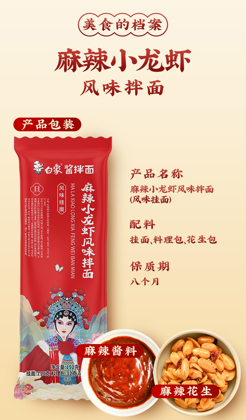 商品名称:白象 热干面163g*2袋+葱油拌面122g*2袋+酸豆角155.5g*2袋+油泼147g*2袋+小龙虾152g*2袋