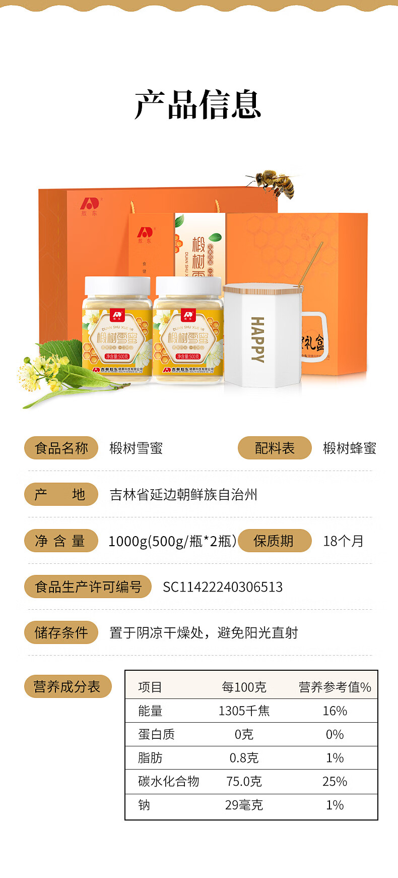 商品名称:敖东椴树雪蜜礼盒 1000克 (500g/瓶*2瓶)