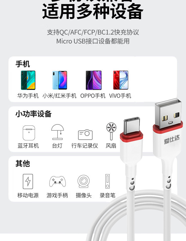 商品名称:J-爱仕达 数据线 充电线1米长 快充多规格苹果/华为/安卓头可选ASD-JC003 白色安卓