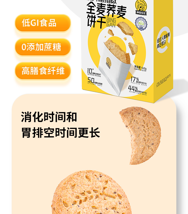 商品名称:神探伍伍 低升糖指数全麦荞麦饼干512g/盒(16g×32袋) 6975016052555