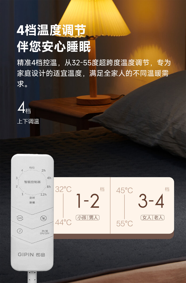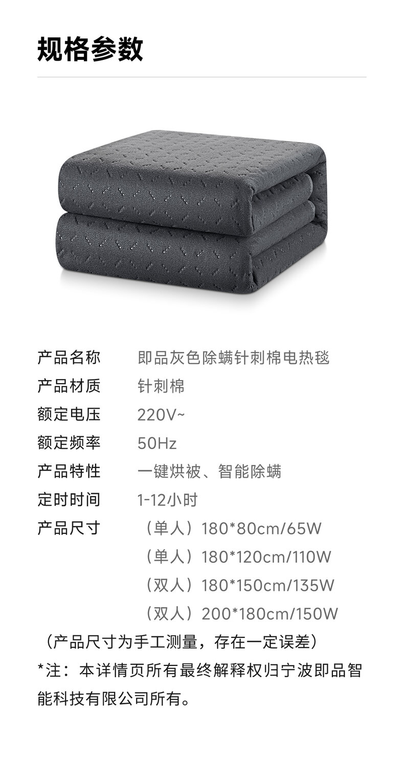 商品名称:即品 灰色无纺布5X除螨针刺棉电热毯200*180 6971594970502
