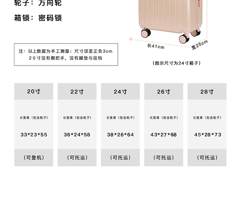 商品名称:圣夫妮时尚拉链款轻音万向轮拉杆箱行李箱 20英寸SFN777-20 粉/白/浅蓝/果绿/黑/红 6972773223907
