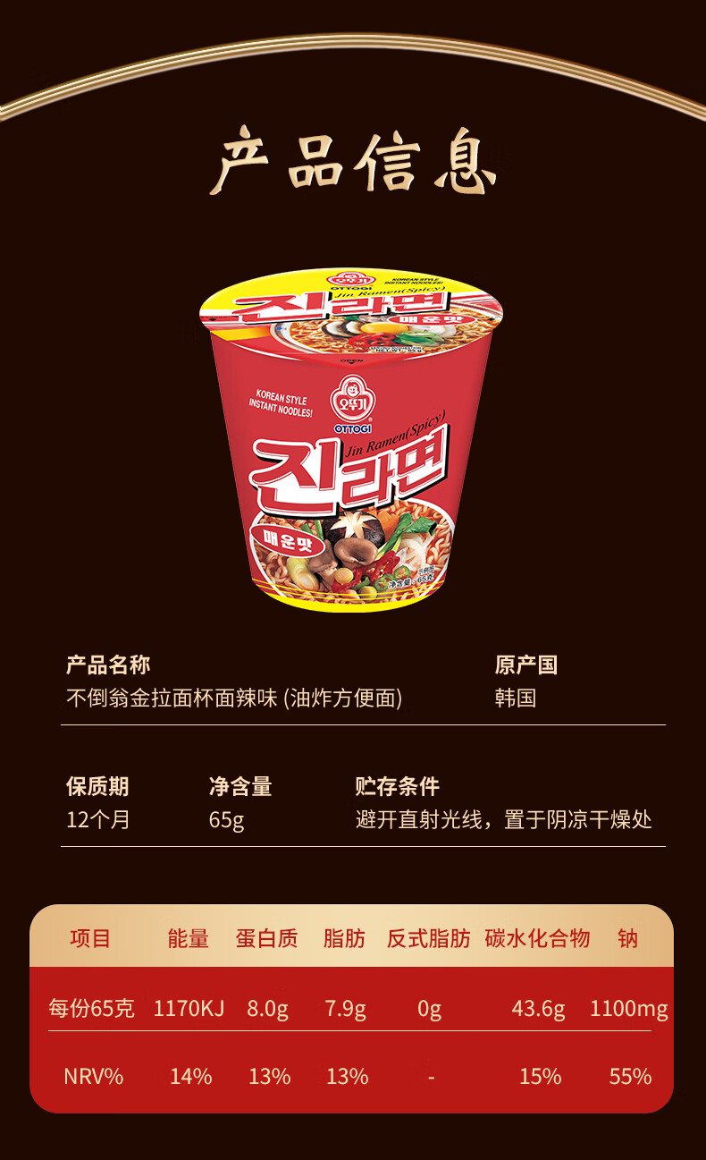 商品名称:韩国进口不倒翁金拉面杯面微辣6杯
