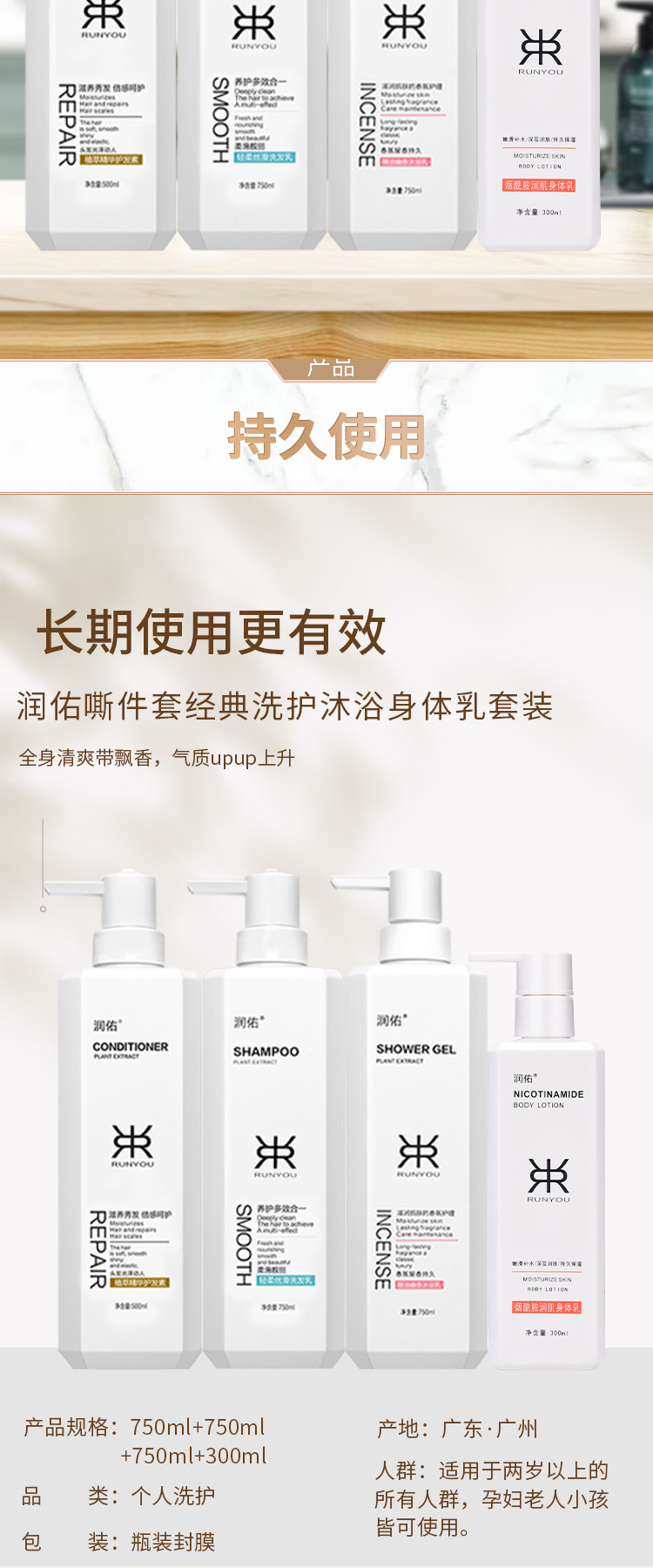 润佑氨基酸洗发水750ml+氨基酸沐浴露750ml+小麦蛋白护发素500ml+烟酰胺身体乳300ml-YA006