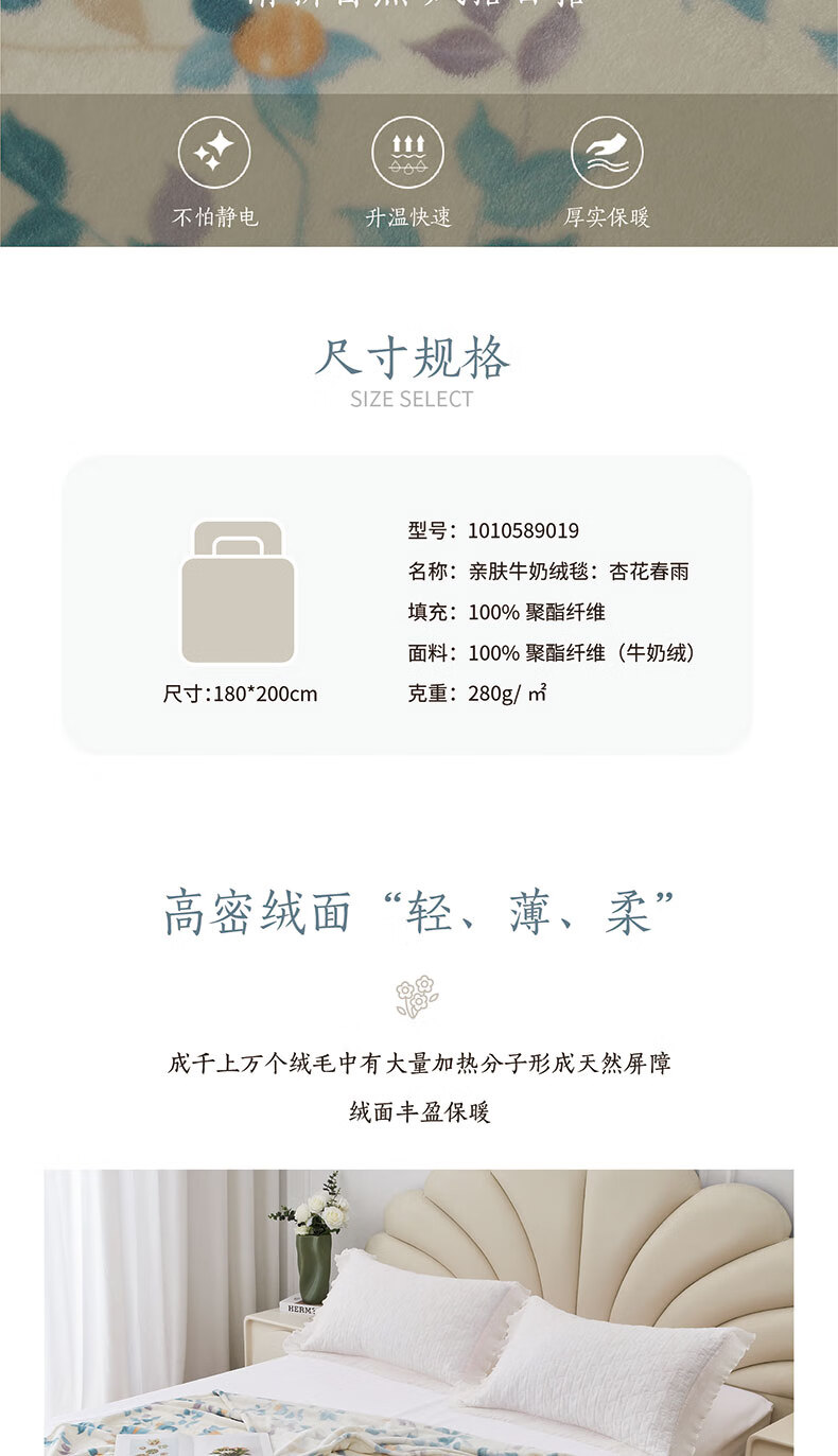 商品名称:梦洁家纺 毛毯法兰绒秋冬宿舍办公室午睡毯子 杏花春雨 150*200cm 6909338250269