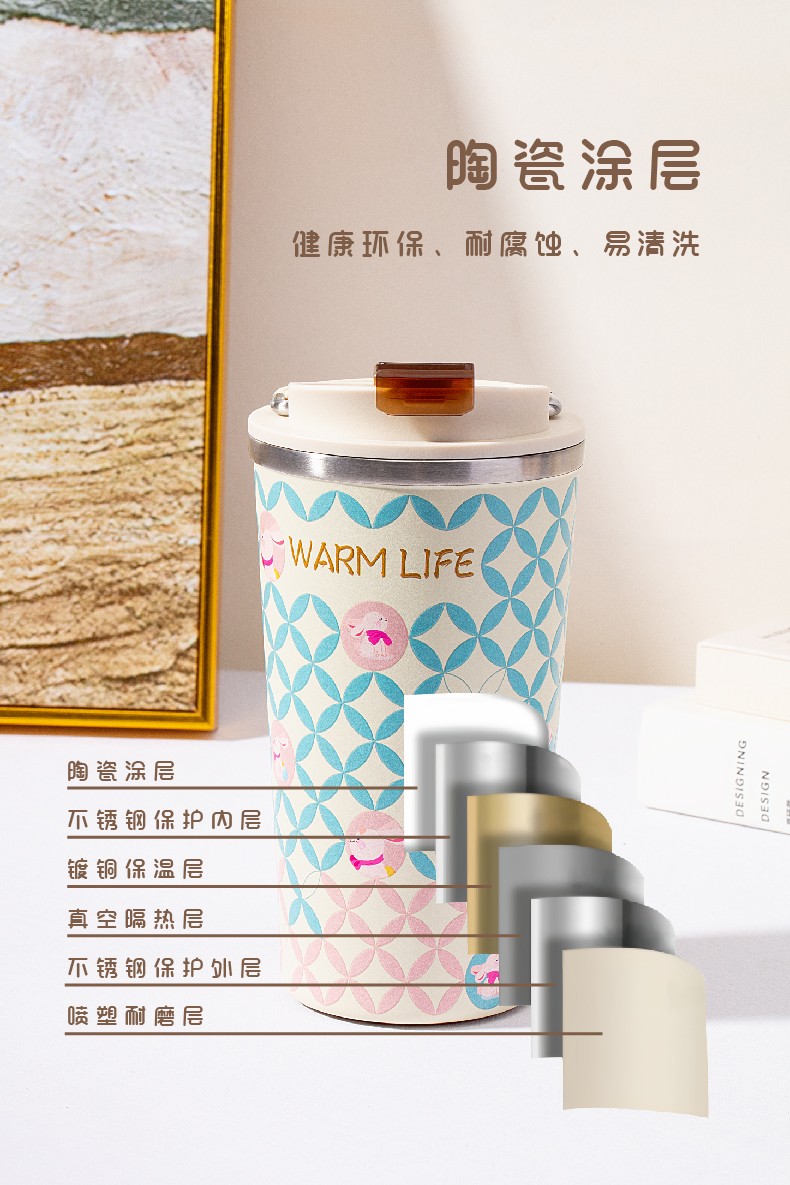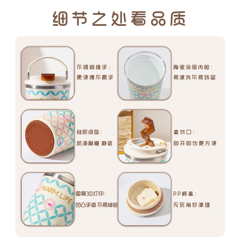 1.黑科技陶瓷内胆:无金属异味 保温 锁鲜 耐酸碱,冷热酸甜都不惧怕 2.百搭魔法杯:咖啡、红茶、果汁、牛奶、中药都可泡