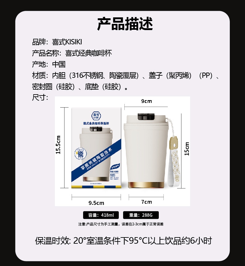 1.黑科技陶瓷内胆:无金属异味 保温 锁鲜 耐酸碱,冷热酸甜都不惧怕 2.百搭魔法杯:咖啡、红茶、果汁、牛奶、中药都可泡