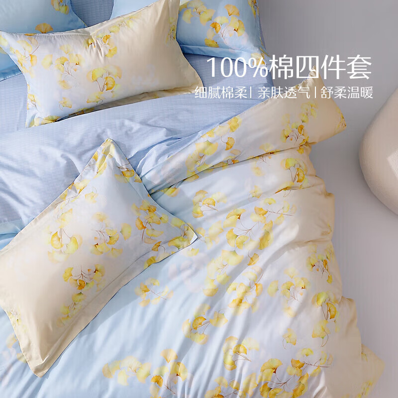 水星家纺四件套床上纯棉100%全棉床单四件套单双人被套枕套1.5米床 繁花遥叶 528882 6923283294963