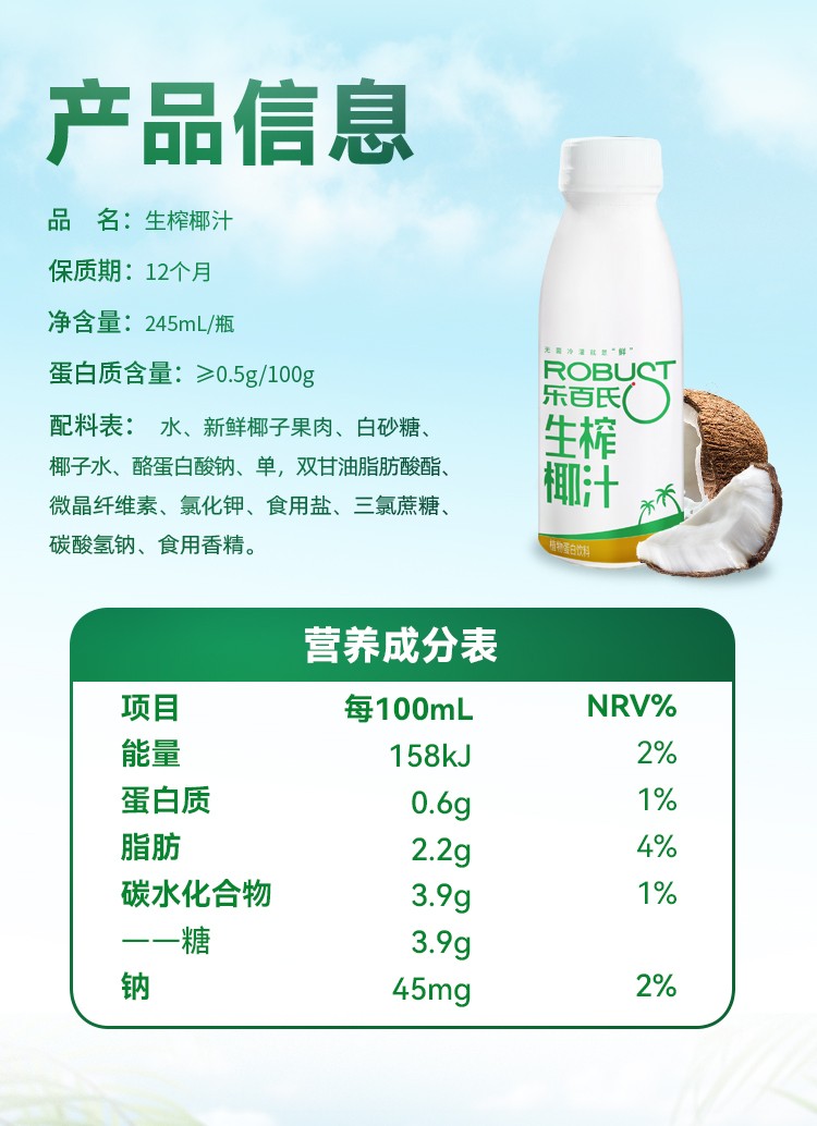 商品名称:乐百氏生榨椰汁245ml*10瓶/箱