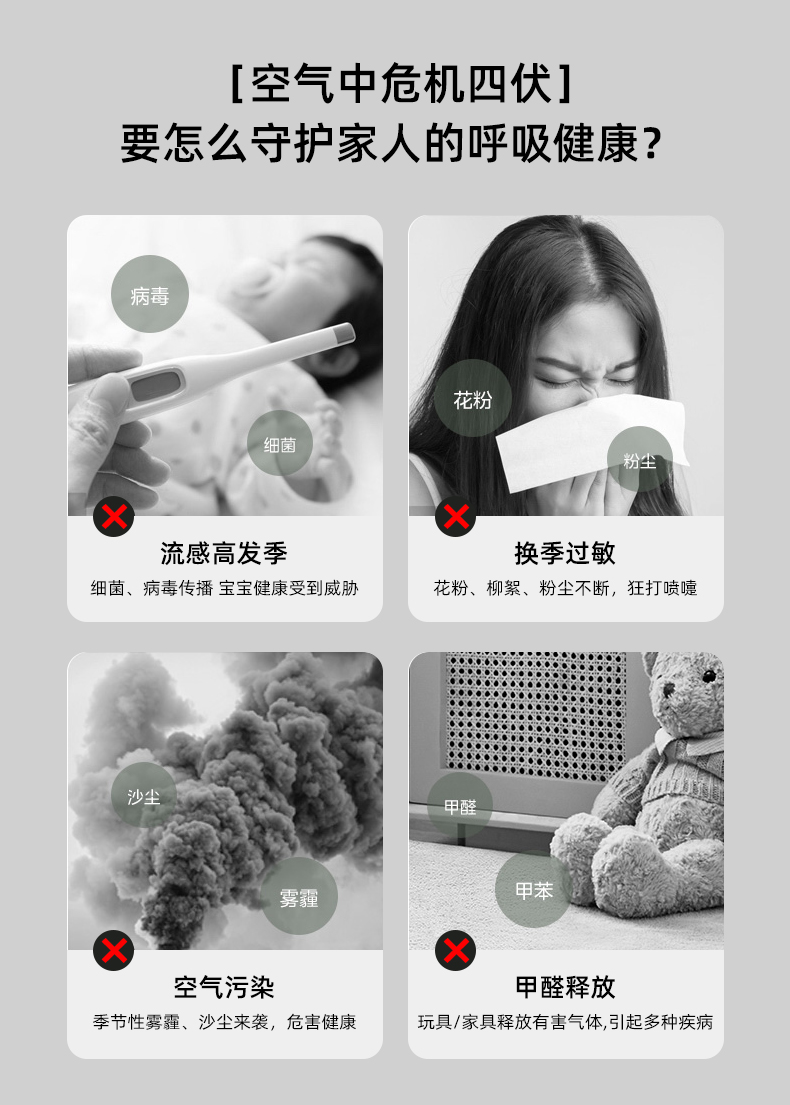 360°环形进风,快速循环净化空气 智慧空气管家,智能触控一体屏,一键健康除醛净化 轻触开关机,短按切换档位,满足不同场