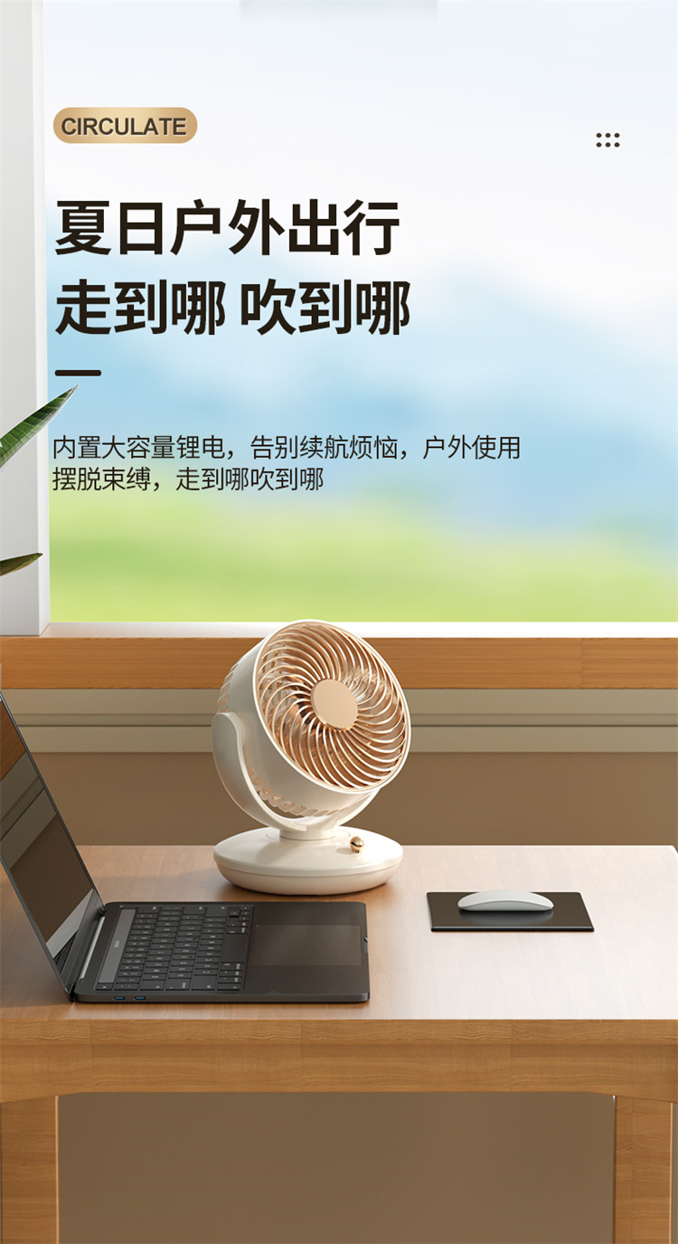可折叠收纳 循环扇强力激活室内空气 摇头角度:左右120° 上下140° 风速:3档调节