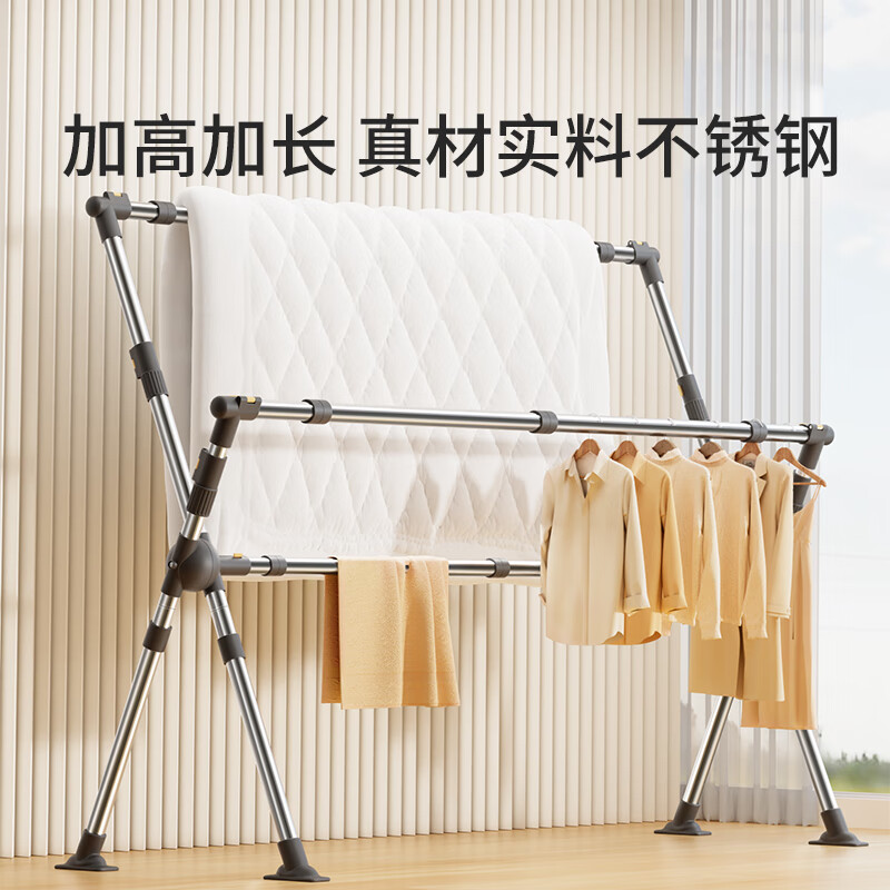 美丽雅晾衣架落地不锈钢阳台折叠伸缩挂衣服室内外晒被子晾衣杆晾晒架 三杆横纵伸缩 6923074092433 偏远另加运费