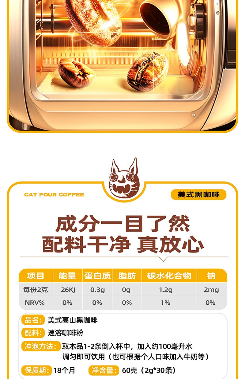 商品名称:四只猫 美式纯黑咖啡100条+双饮杯(285x2+077)