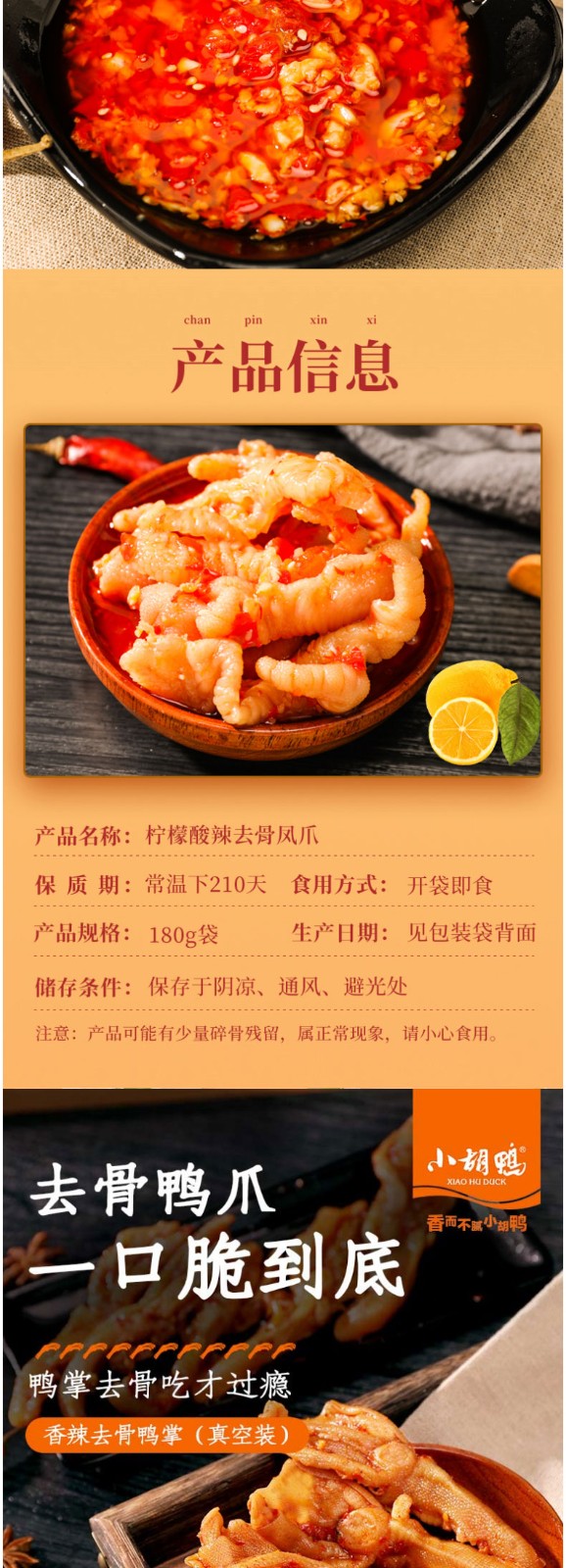 商品名称:小胡鸭卤味休闲零食组合十六 (柠檬酸辣去骨凤爪+香辣去骨鸭掌)
