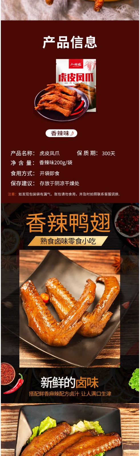 商品名称:小胡鸭卤味休闲零食组合二十三 (鸭脖+鸭翅+虎皮凤爪)