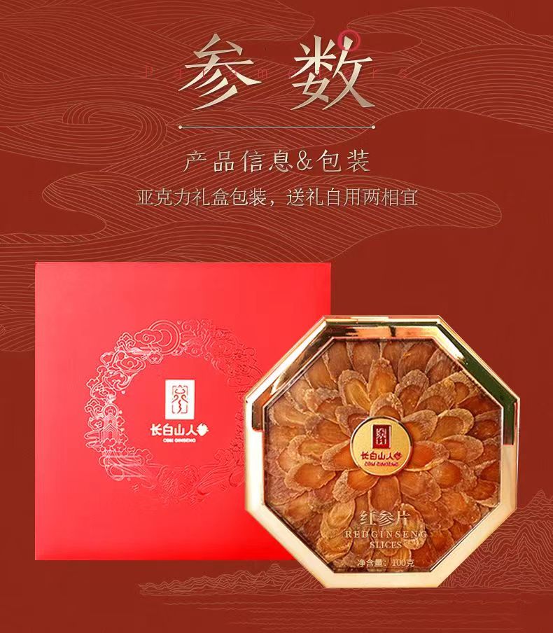 商品名称:长白山人参 红参排片八角礼盒100g 6970044562717