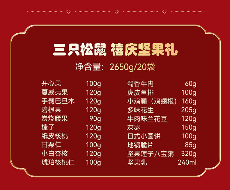 商品名称:三只松鼠禧庆礼428型 坚果 2650g/20袋 6942209666363