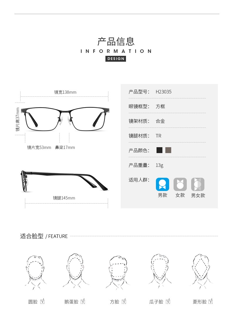 商品名称:海伦凯勒0度防蓝光护目镜 男女同款 商务有型H23035C2M-FLG