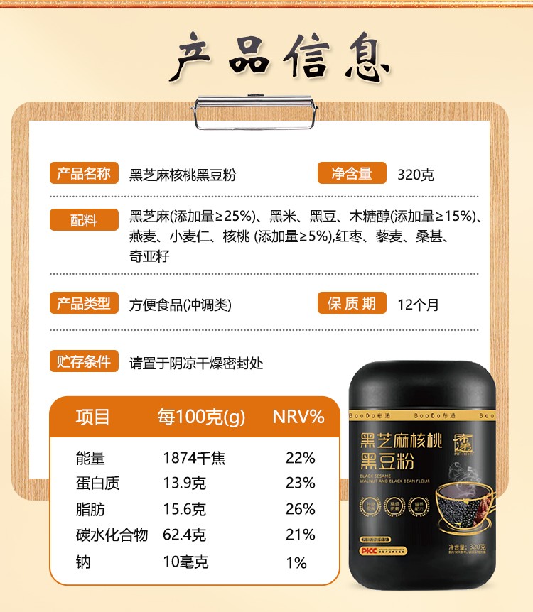 商品名称:BooDo布递黑芝麻核桃黑豆粉320g