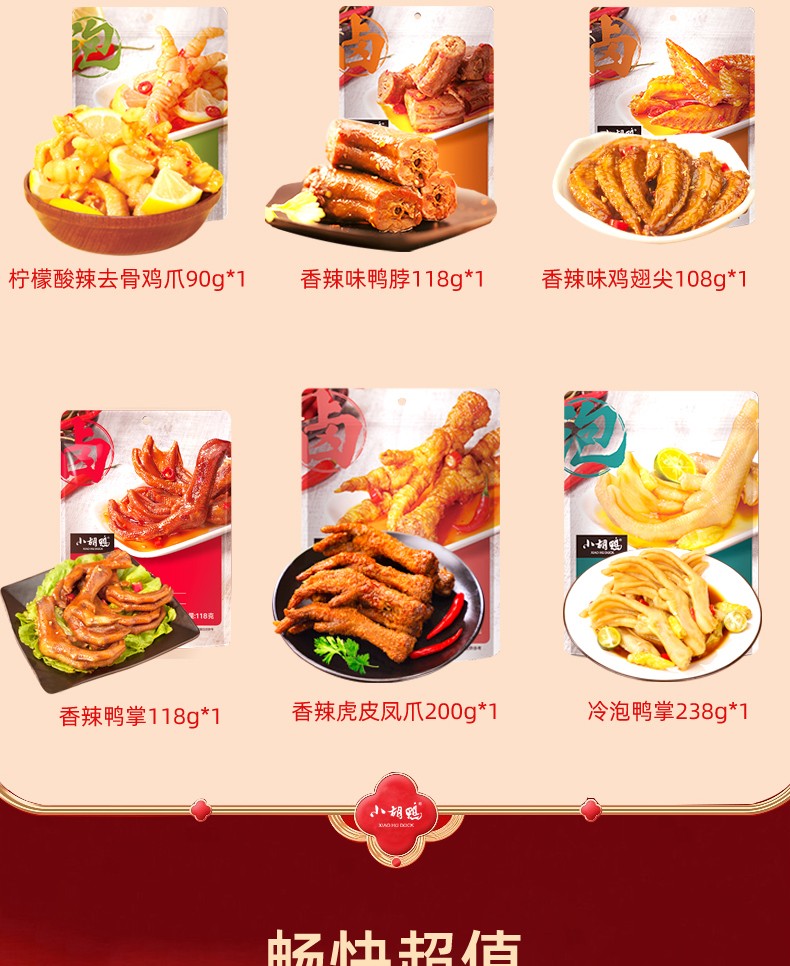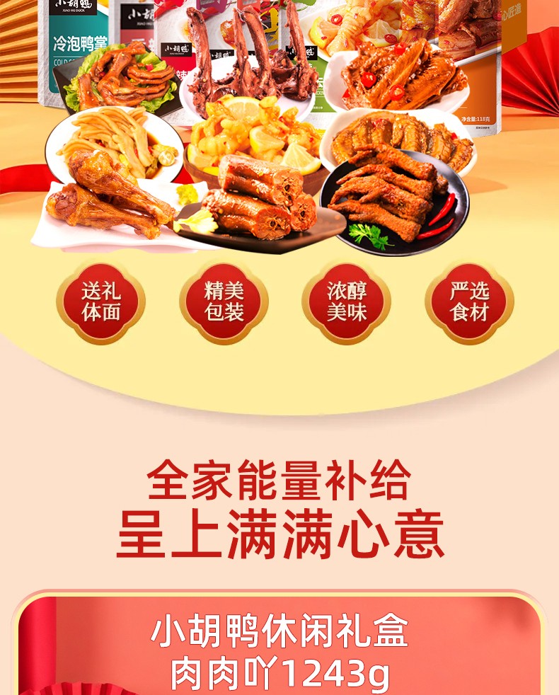 商品名称:小胡鸭 休闲礼盒啃定吖1317g 鸭掌鸭翅等熟食 6944453280111