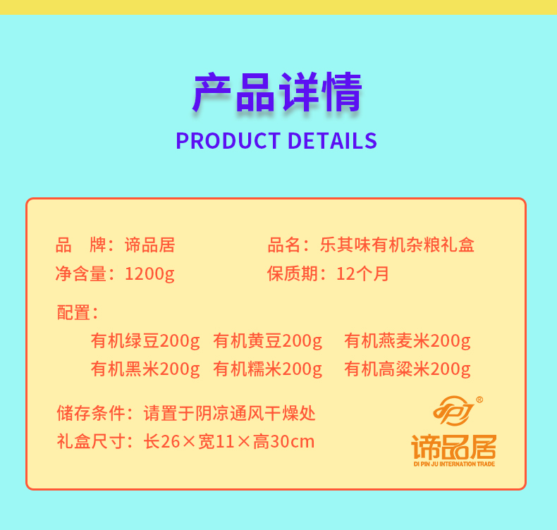 商品名称:谛品居--乐其味有机杂粮礼盒1.2kg 6971021822916 偏远另加运费