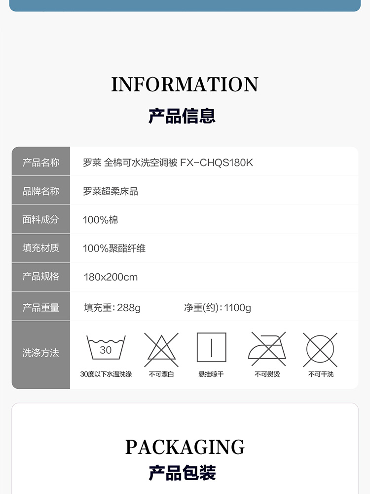 商品名称:罗莱 全棉可水洗空调被 FX-CHQS180K 180*200cm 6901974298902