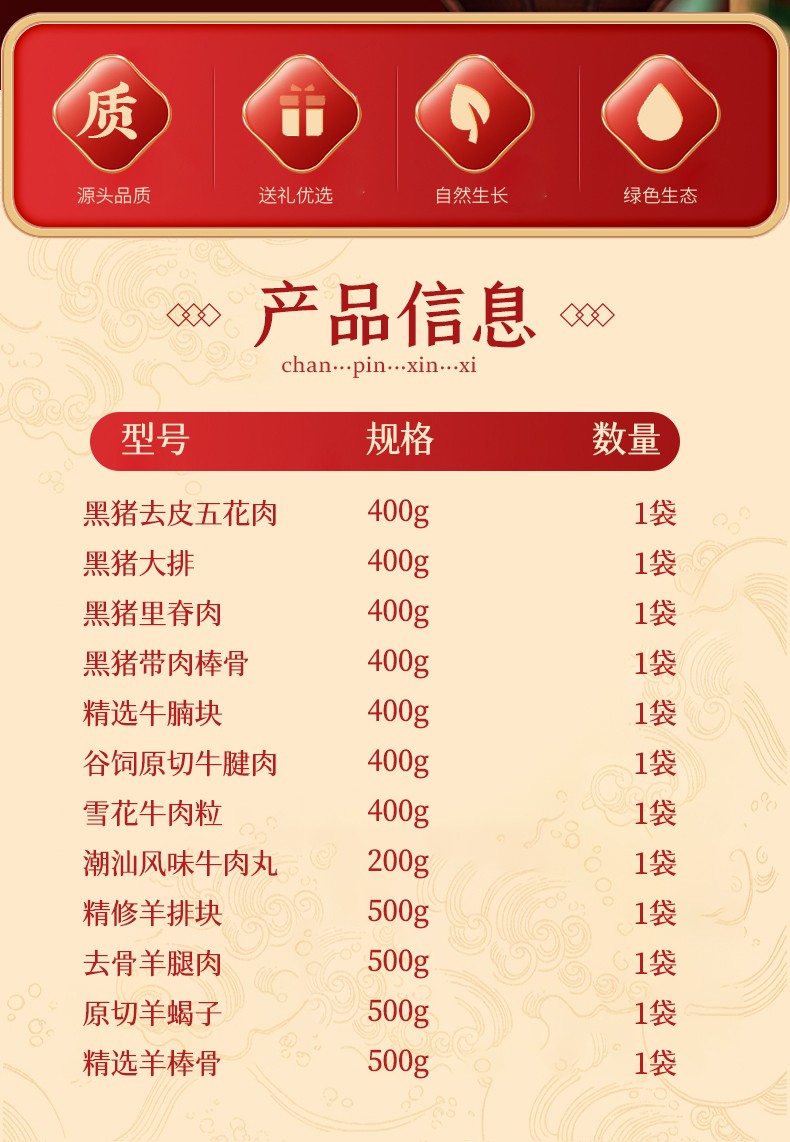商品名称:品尊轩 猪牛羊组合套餐898型5000g 6975687972275