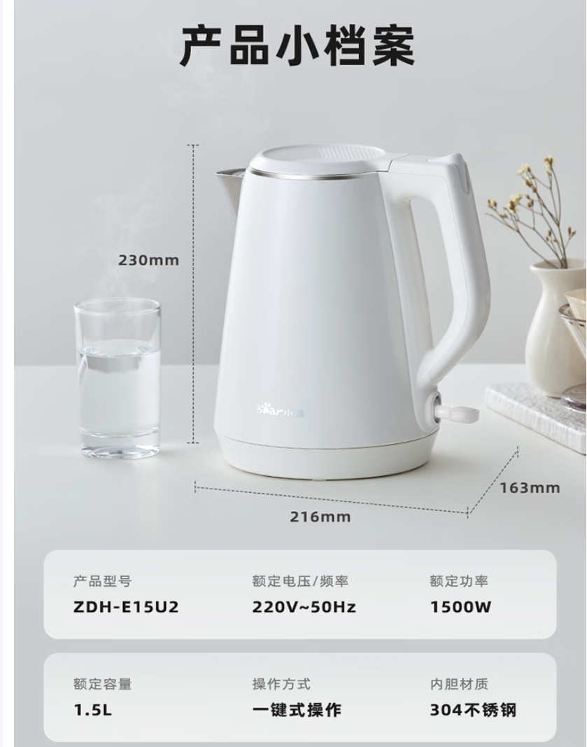 小熊(Bear)烧水壶电水壶电热水壶开水壶1.5L大容量 ZDH-E15U2 1.5L 6940971255051
