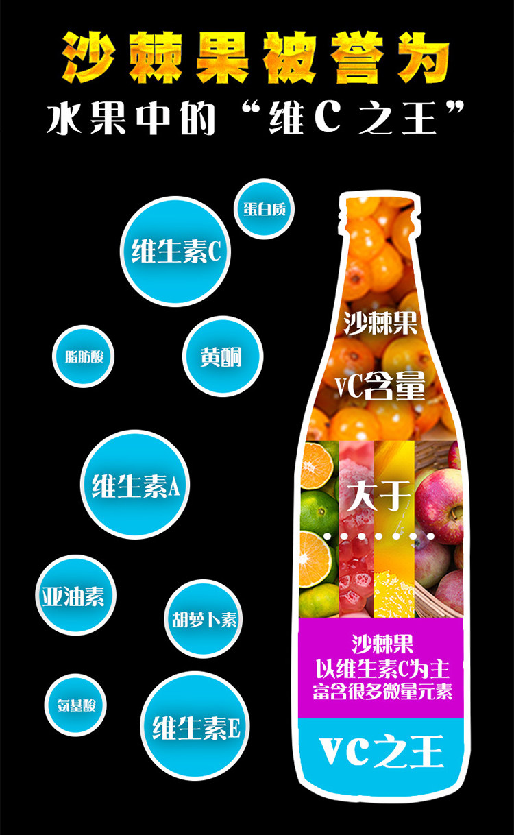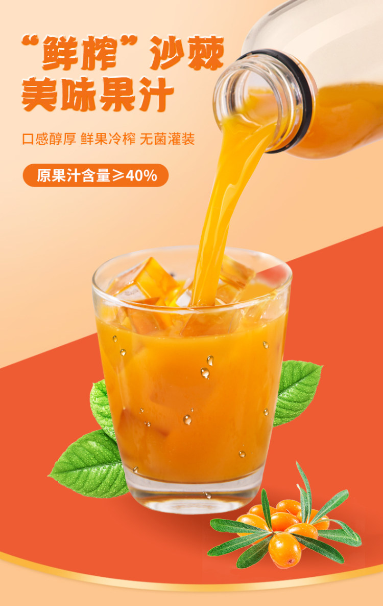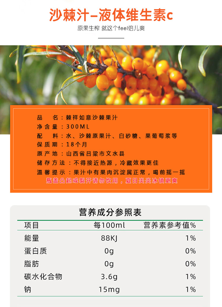商品名称:交城山吕梁野生鲜榨VC沙棘果汁酸甜爽口300ml/瓶*8瓶