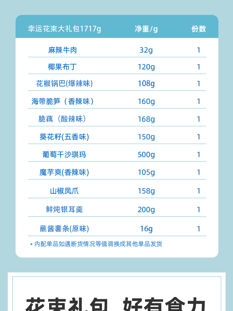 商品名称:良品铺子 幸运花礼花束大礼包298型1717g 6976655860020