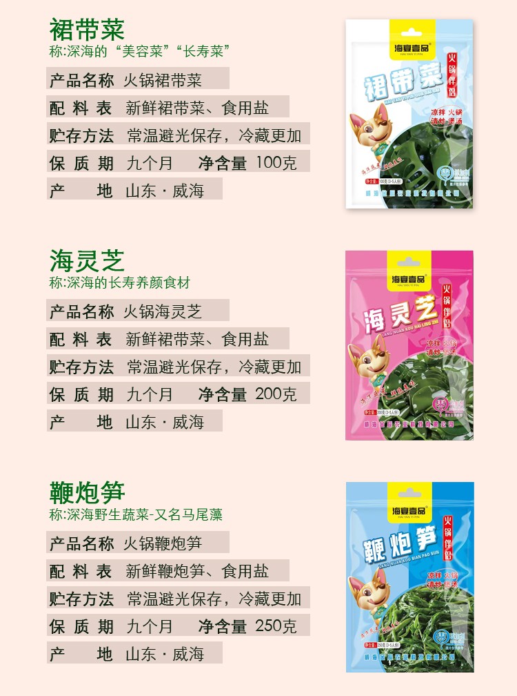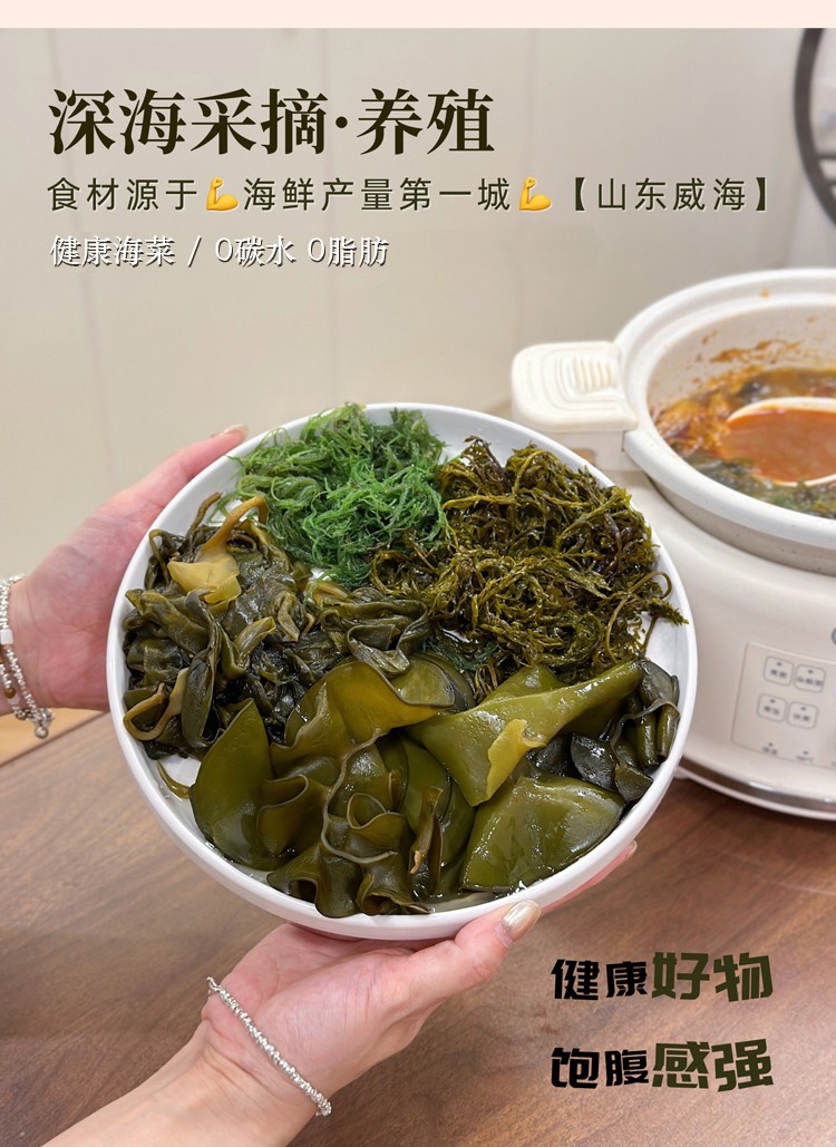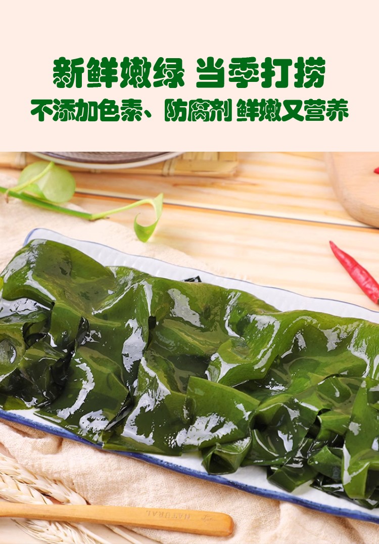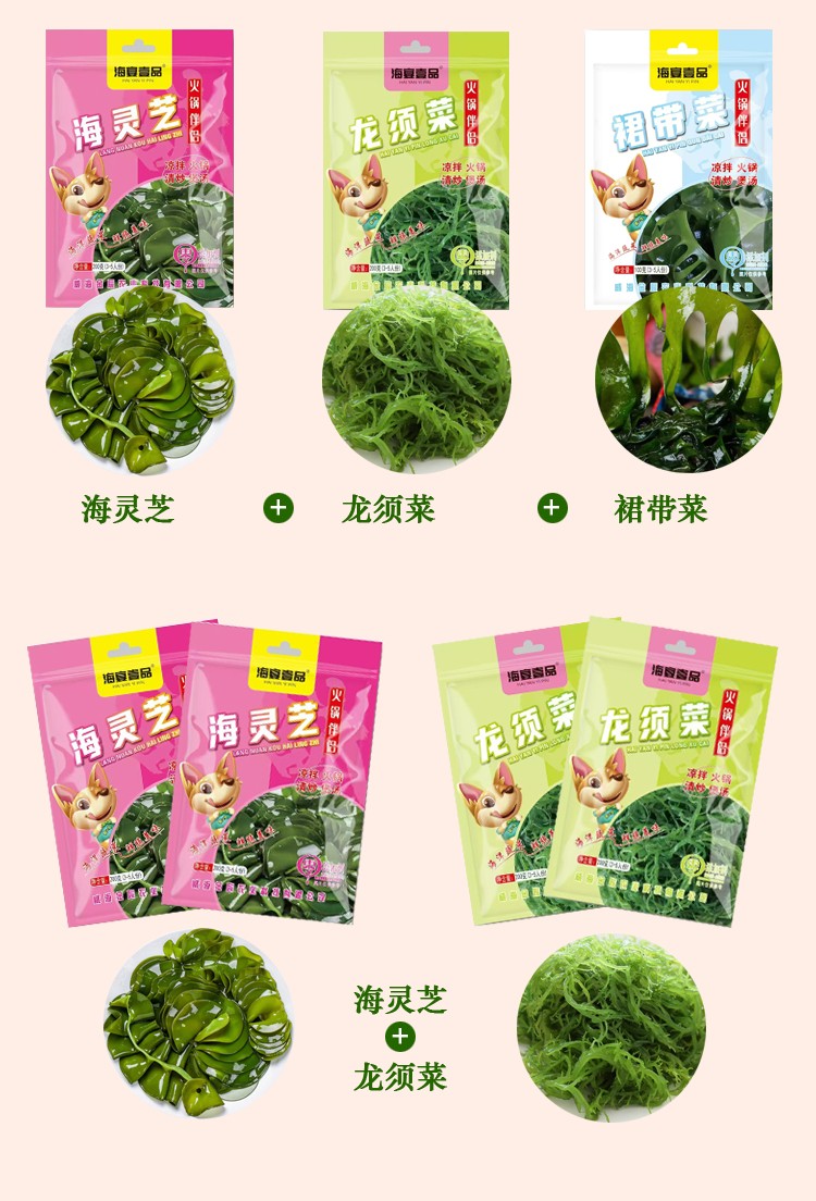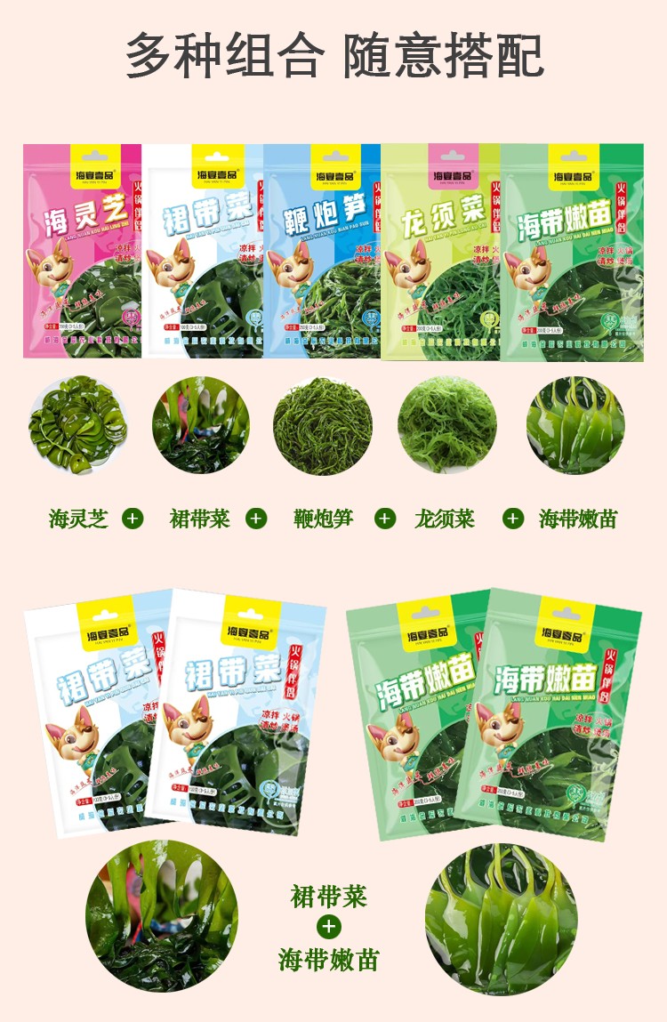 商品名称:海宴壹品0添加0脂肪海菜组合(海带嫩苗+海灵芝+龙须菜各1袋+裙带菜2袋共5袋)【海菜大全实惠组合】
