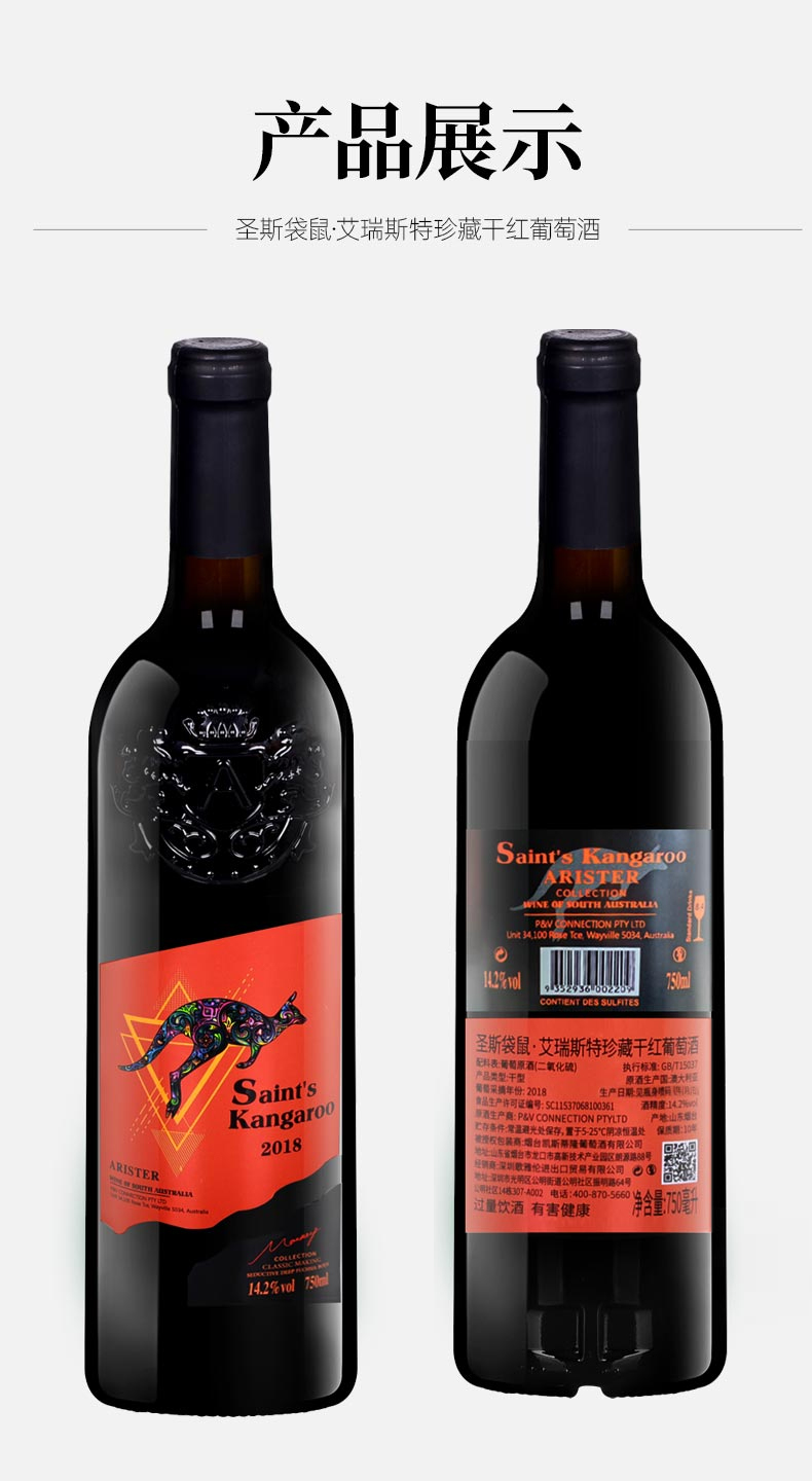 商品名称:圣斯袋鼠 艾瑞斯特珍藏干红葡萄酒 14.2%vol干红葡萄酒 红酒 750ml/瓶 单瓶装 澳洲原酒进口(箱规:6瓶/箱)
