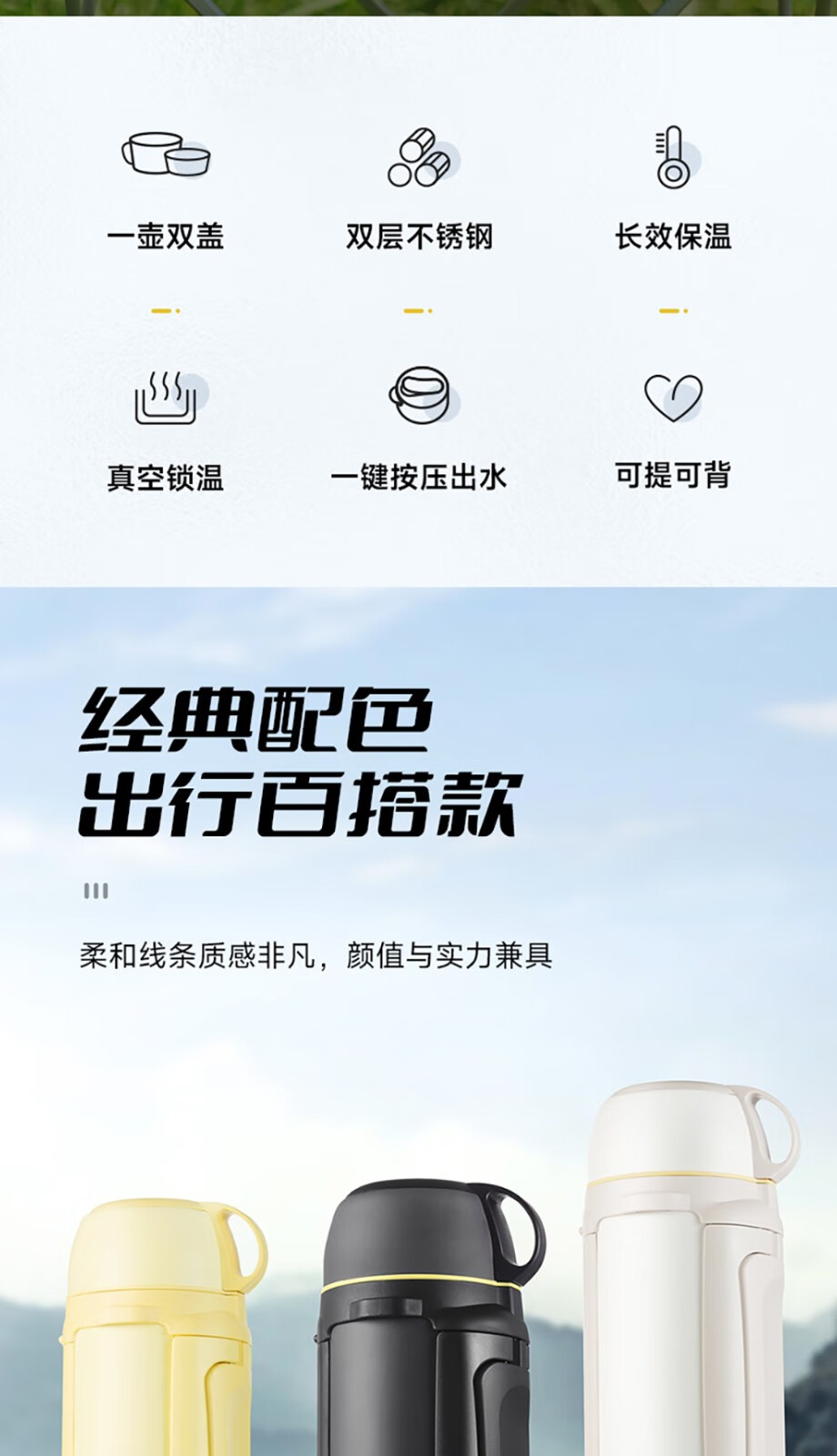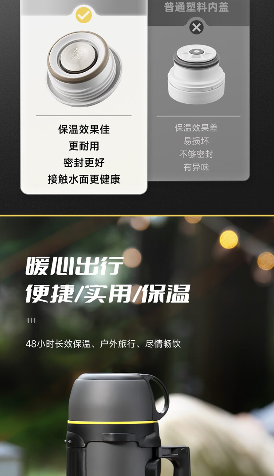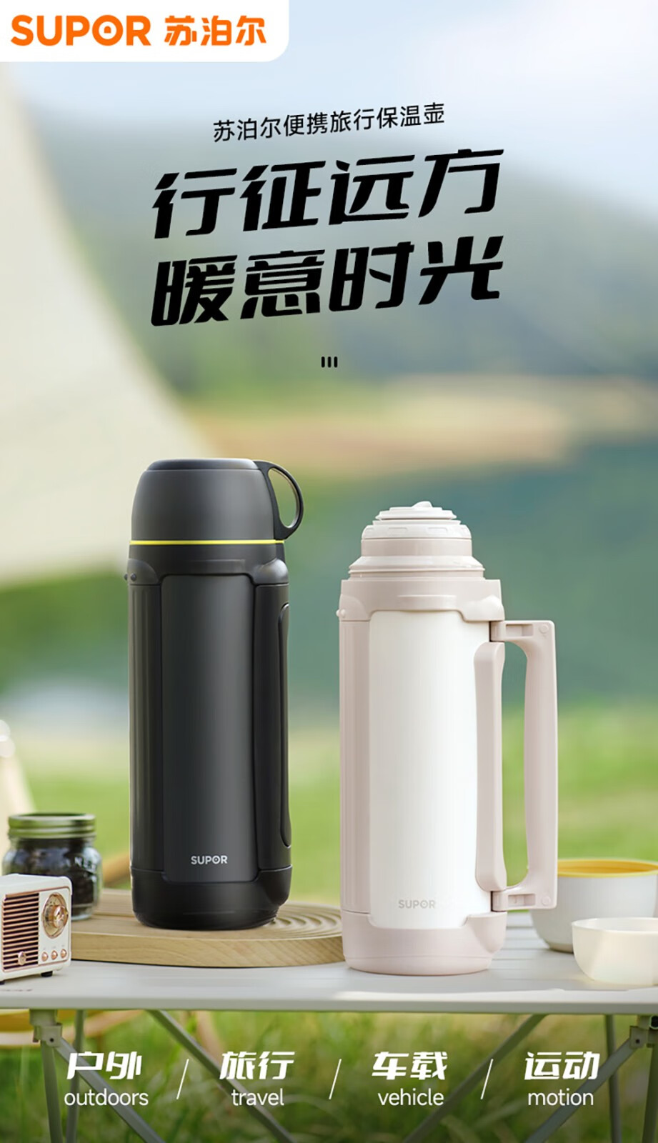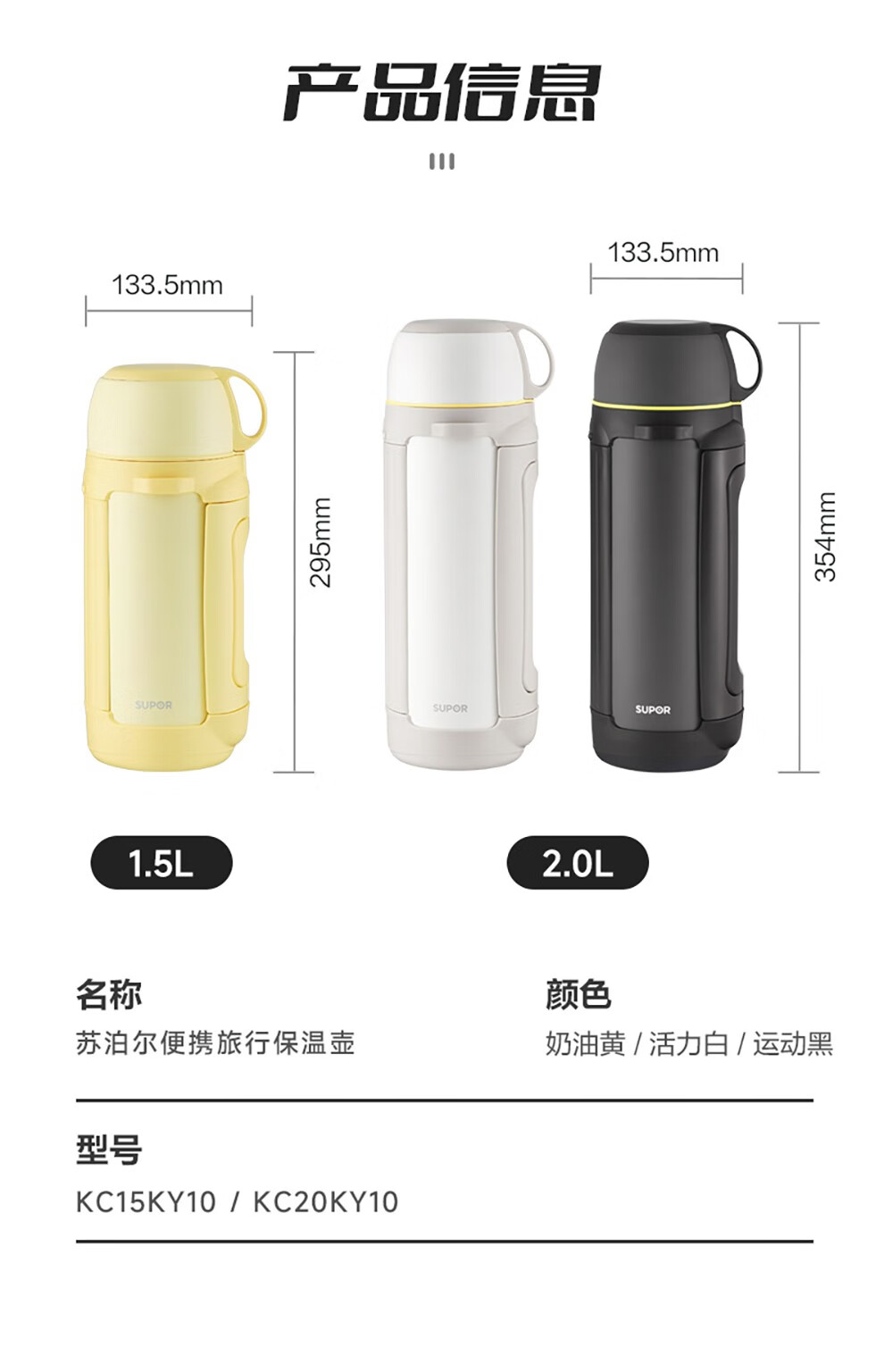 商品名称:苏泊尔(SUPOR)保温壶户外旅行便携家用保温壶大容量不锈钢车载式热暖水瓶 KC15KY10 奶油黄【48小时保温】 1.5L 6950885598656