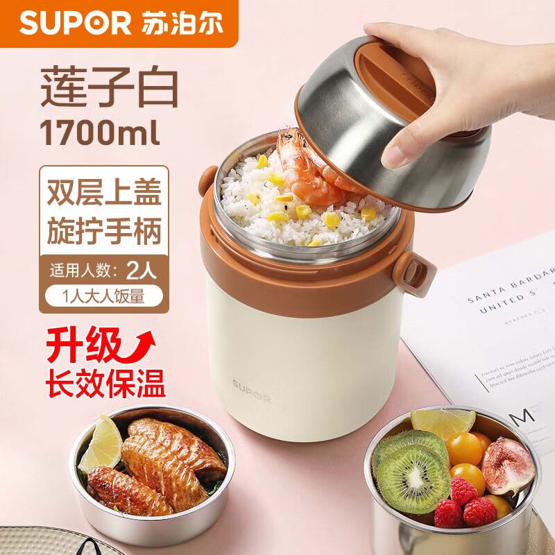 苏泊尔保温饭盒不锈钢提锅1.7L大容量真空保温桶多层便携便当盒 莲子白/绿 KFV17AC10