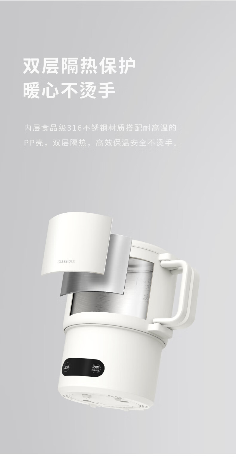 GLASSLOCK便携式烧水壶 电热折叠水壶 316不锈钢周末假期旅行出国出差住酒店养生壶学生宿舍小煮锅泡面杯 0.7L GE-TH06WH-W 6976852521748