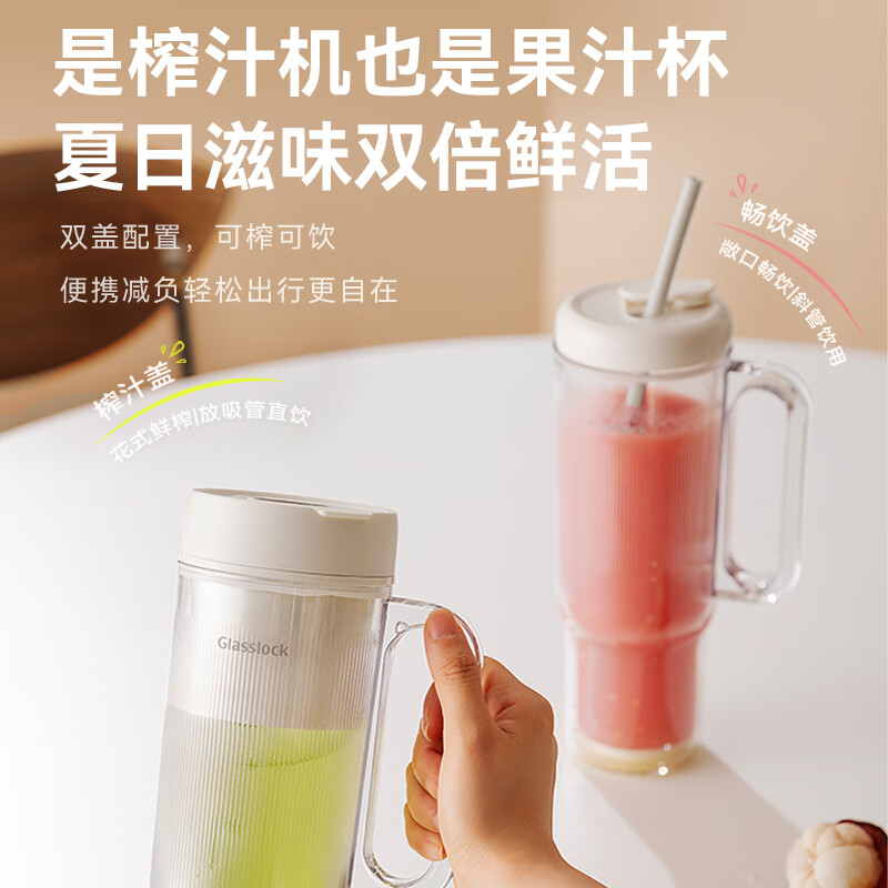 GLASSLOCK冰霸榨汁杯车载便携式果蔬搅拌杯吨吨杯吸管杯婴儿辅食机电动多功能12叶304不锈钢碎冰刀果汁杯 GE-JU03BMB 6976852523483