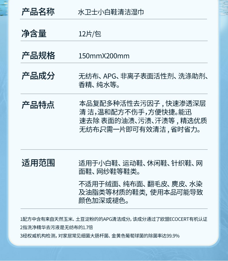商品名称:水卫士 小白鞋湿巾12片/袋 6973688402791 新疆西藏另加运费