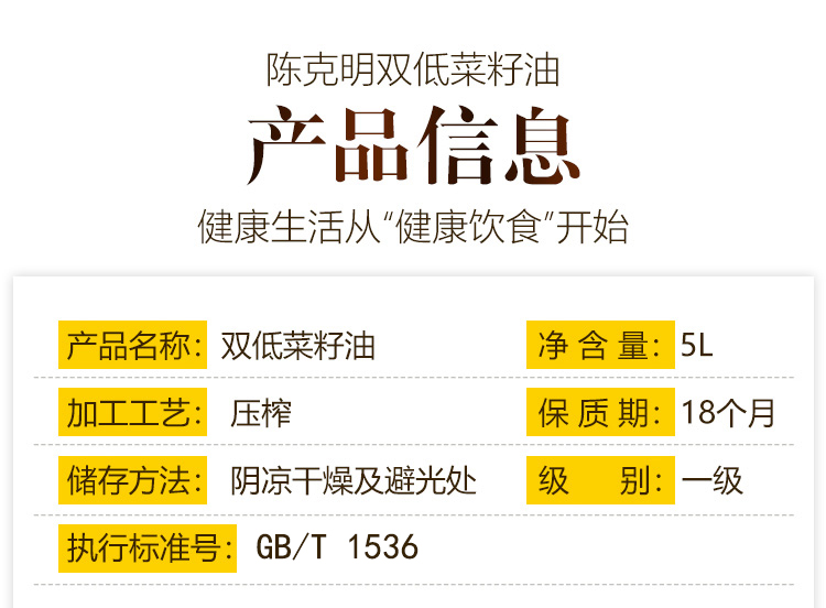 商品名称:陈克明5L双低菜籽油 6972391730023 偏远地区不发货