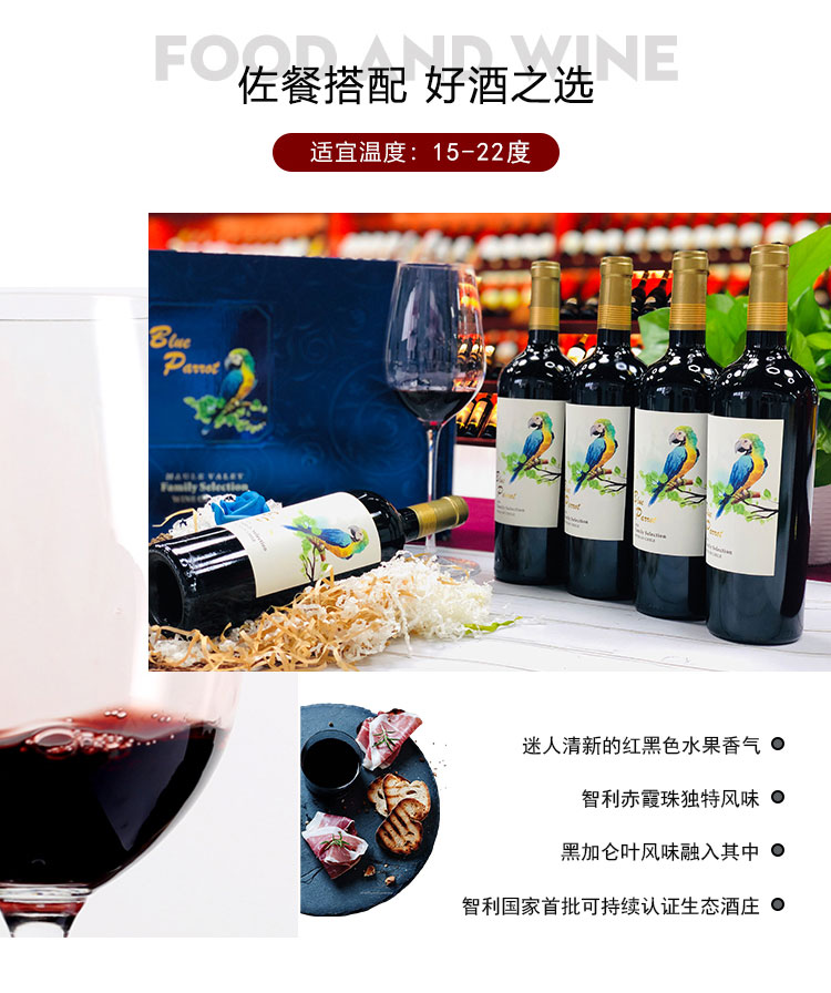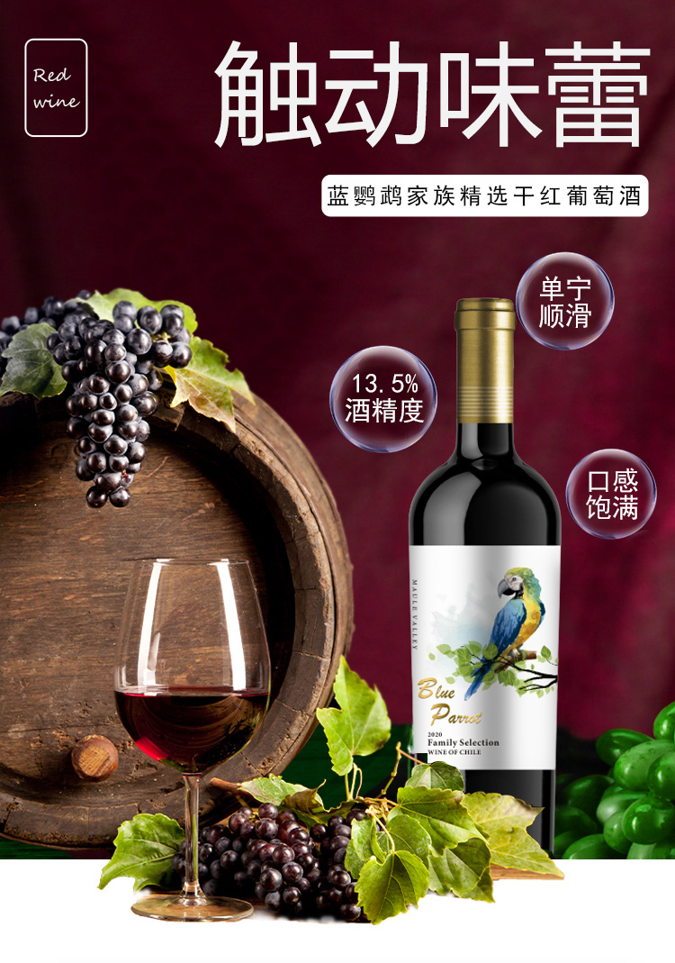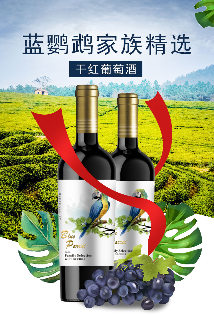 商品名称:J-智利原瓶进口爱乐威蓝鹦鹉家族精选干红葡萄酒红酒750ml/瓶 750ml/瓶