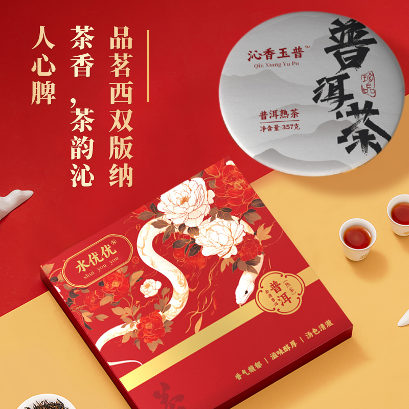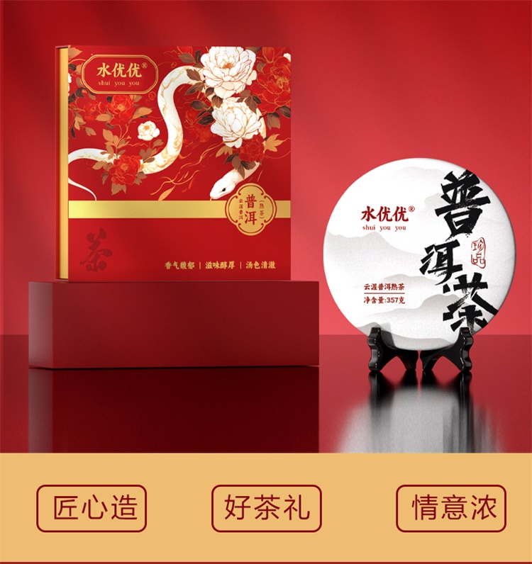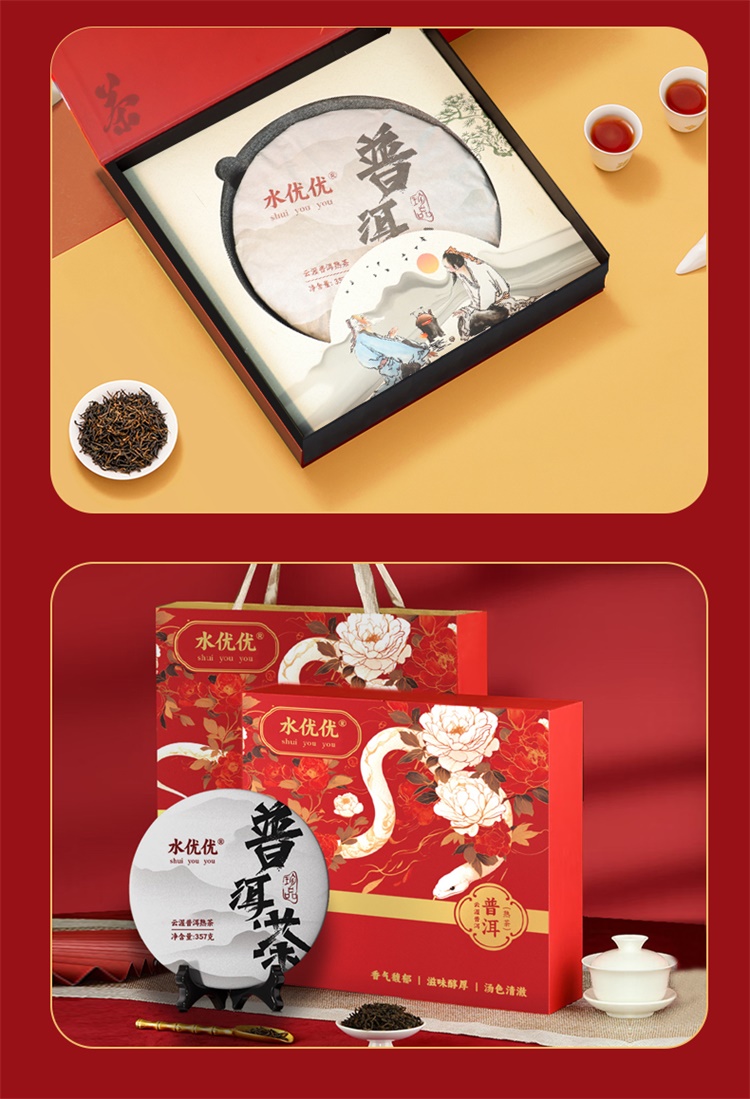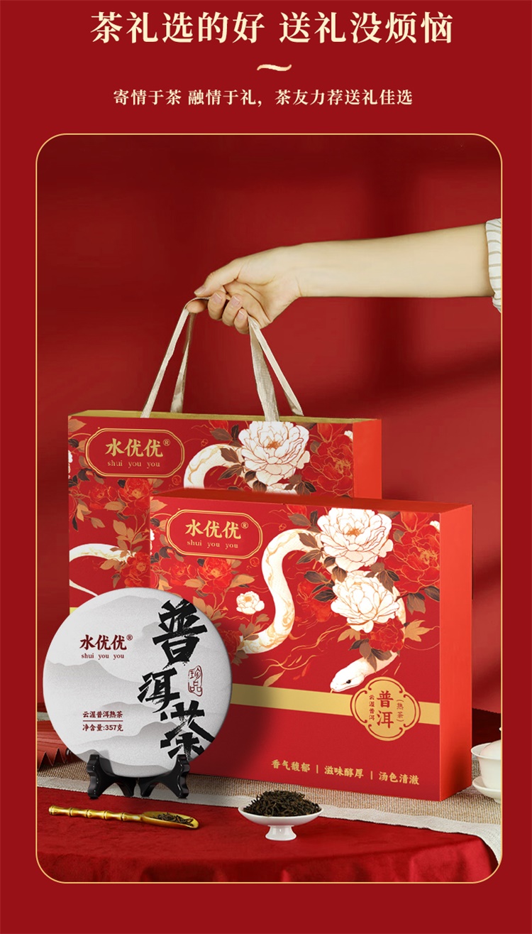 J-水优优普洱茶熟茶357g 礼盒+手提袋 茶饼送礼首选佳品精美手提茶叶礼盒装 企业福利