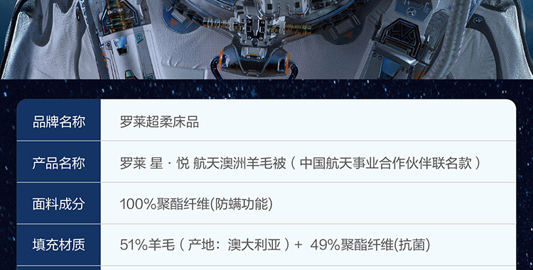 商品名称:J-罗莱 星悦 航天防螨羊毛被子【中国航天事业合作伙伴联名款】200*230cm