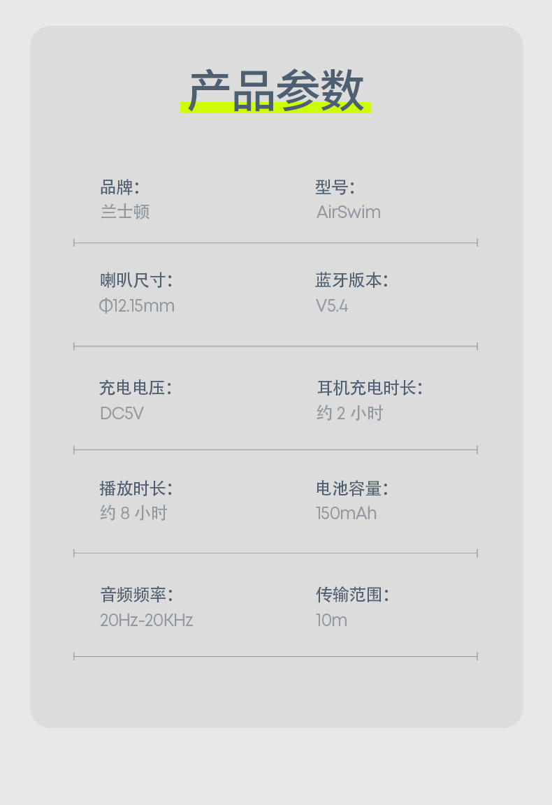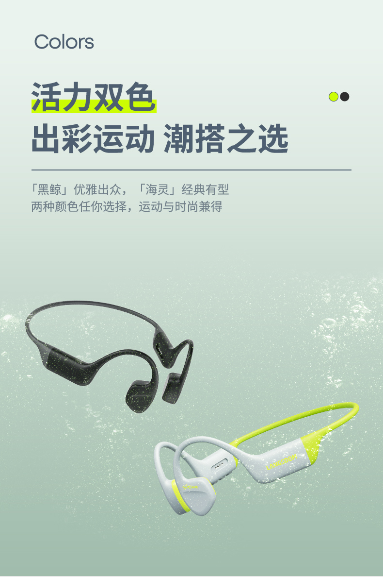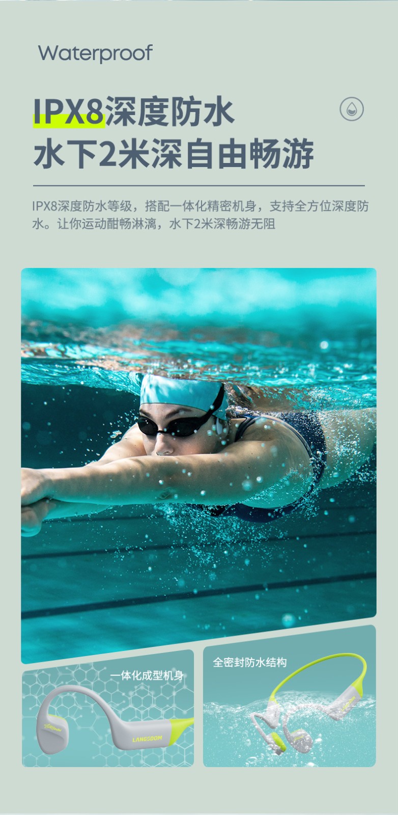 1.IPX8专业深度防水认证,水下2米深自由畅游,适用游泳等水上运动场景