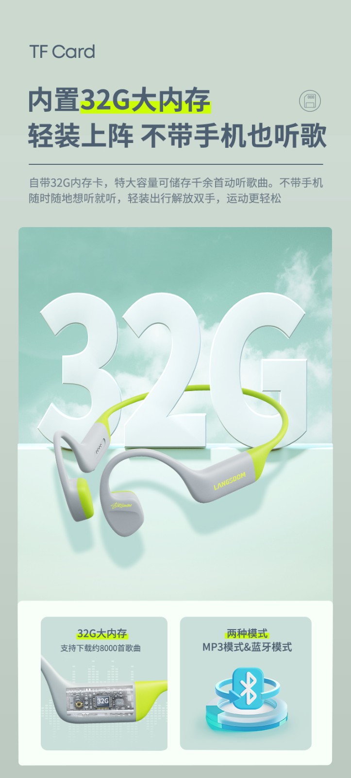 2.出门不用手机也能听歌,内置32G大内存,海量存歌上千