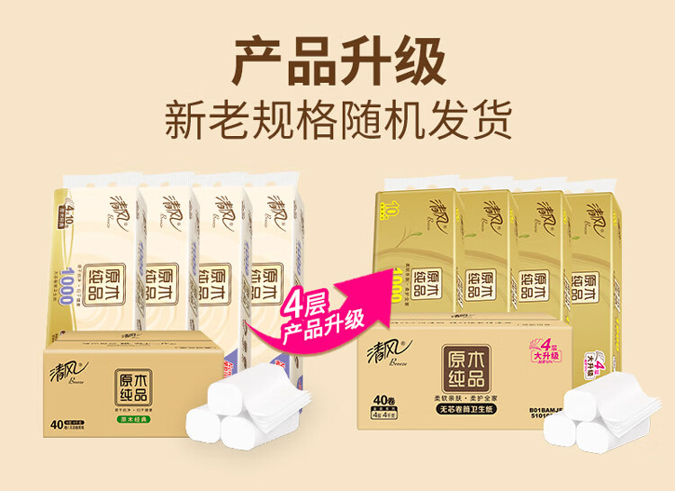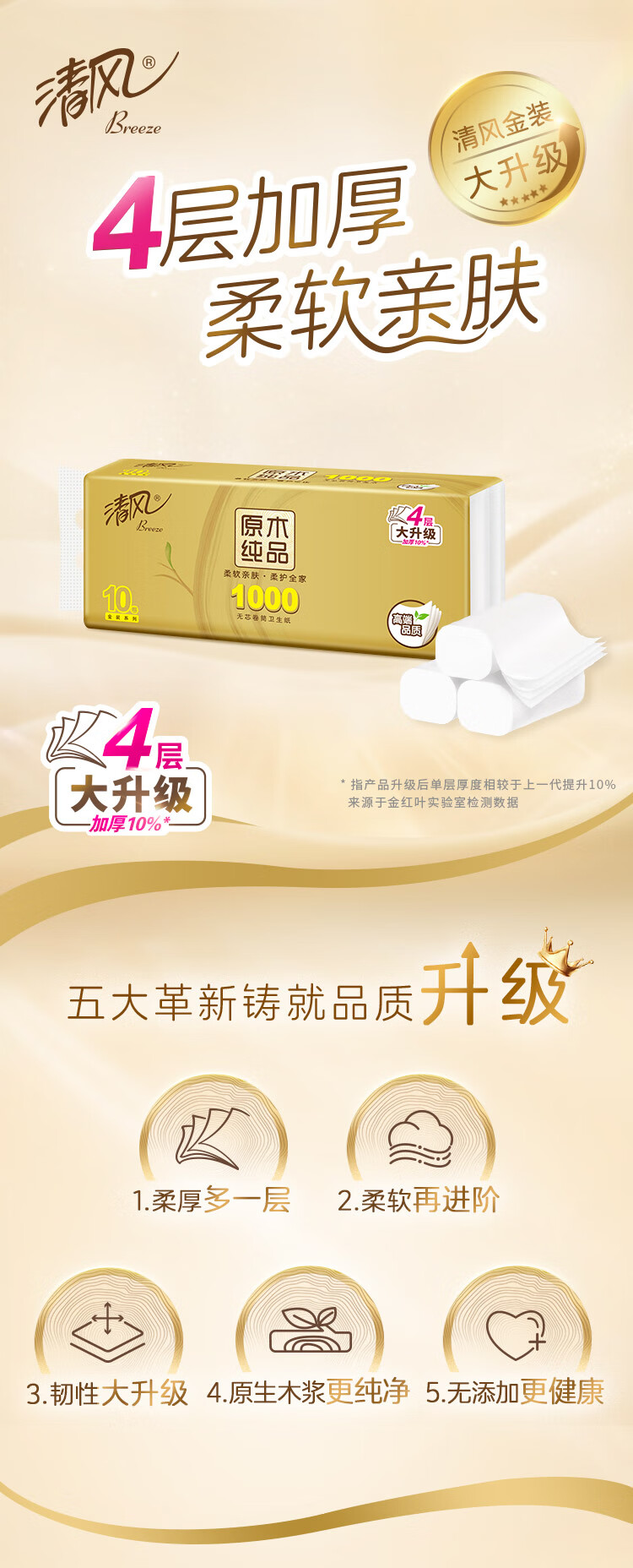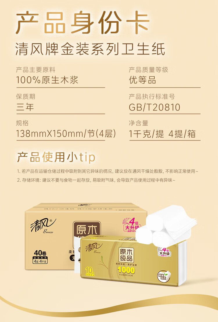 清风原木金装无芯卷纸4层100克*10卷/提4提一箱B01BAMJE/51010567码6922266450853